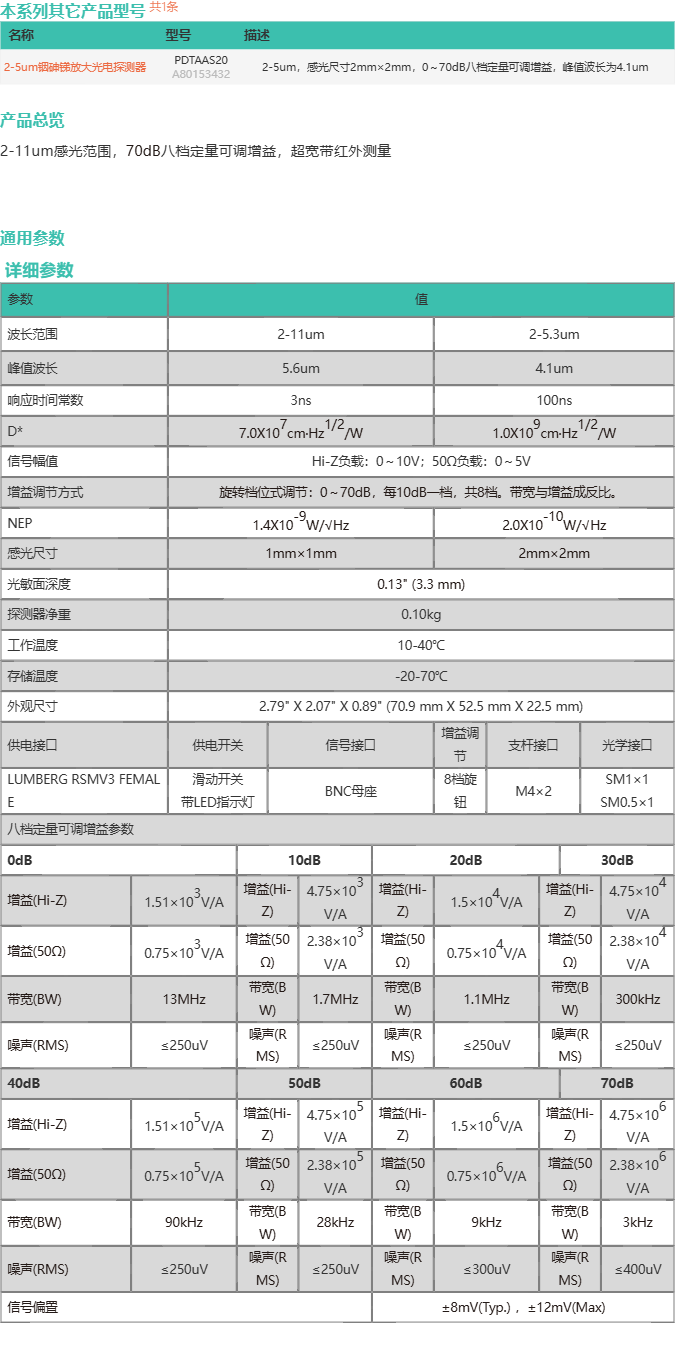 2-11um銦砷銻放大光電探測器